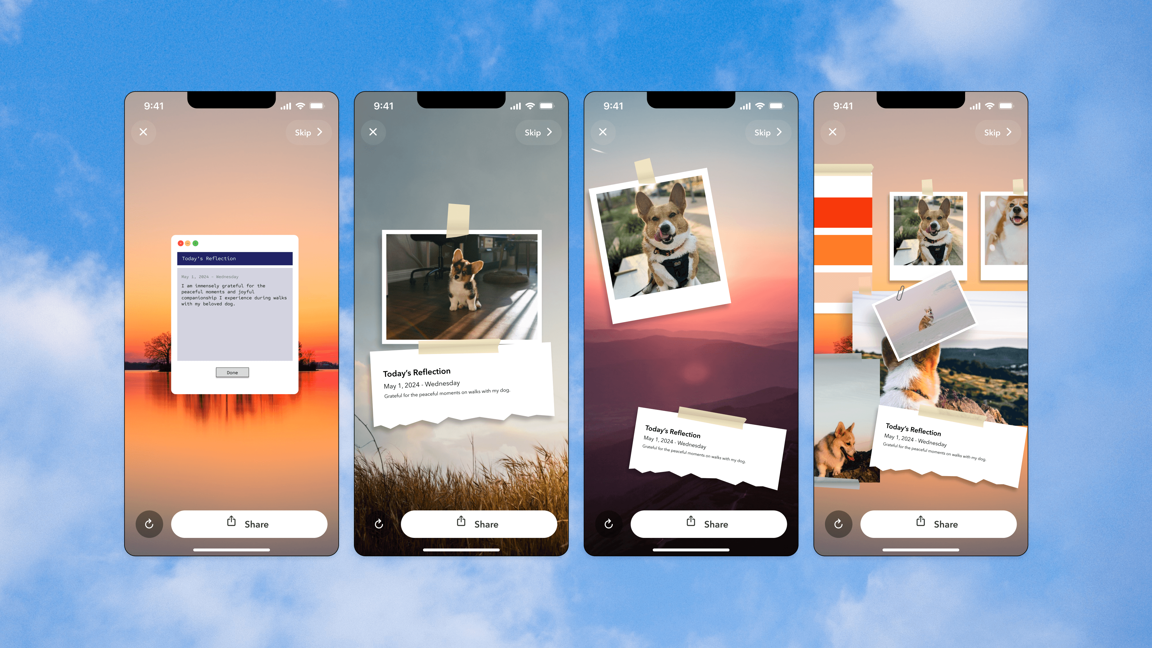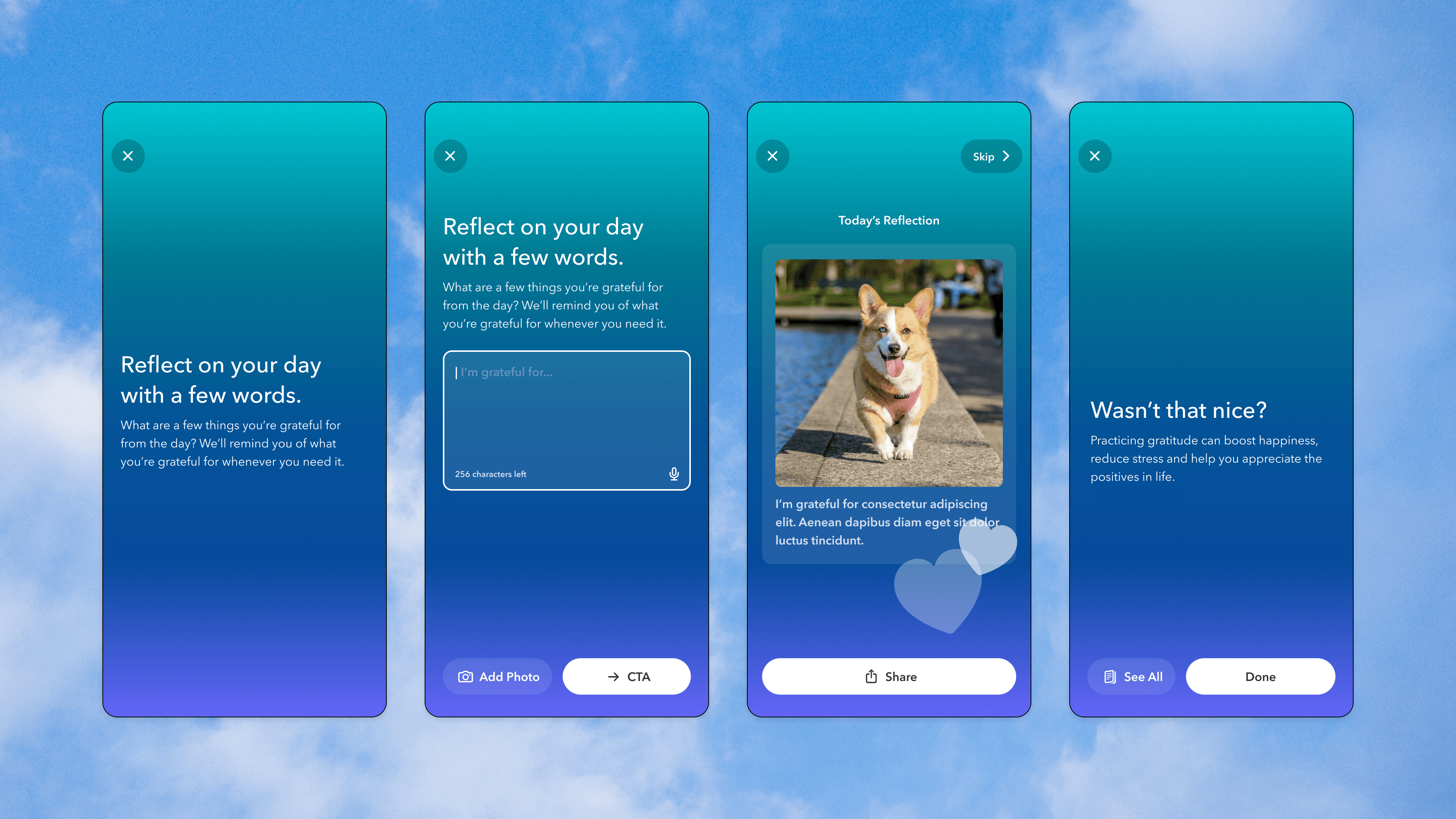 The goal was to create a compelling visual output that encouraged users to reflect on their day, document what they’re grateful for, and feel proud to share it, blending introspection with creative expression.